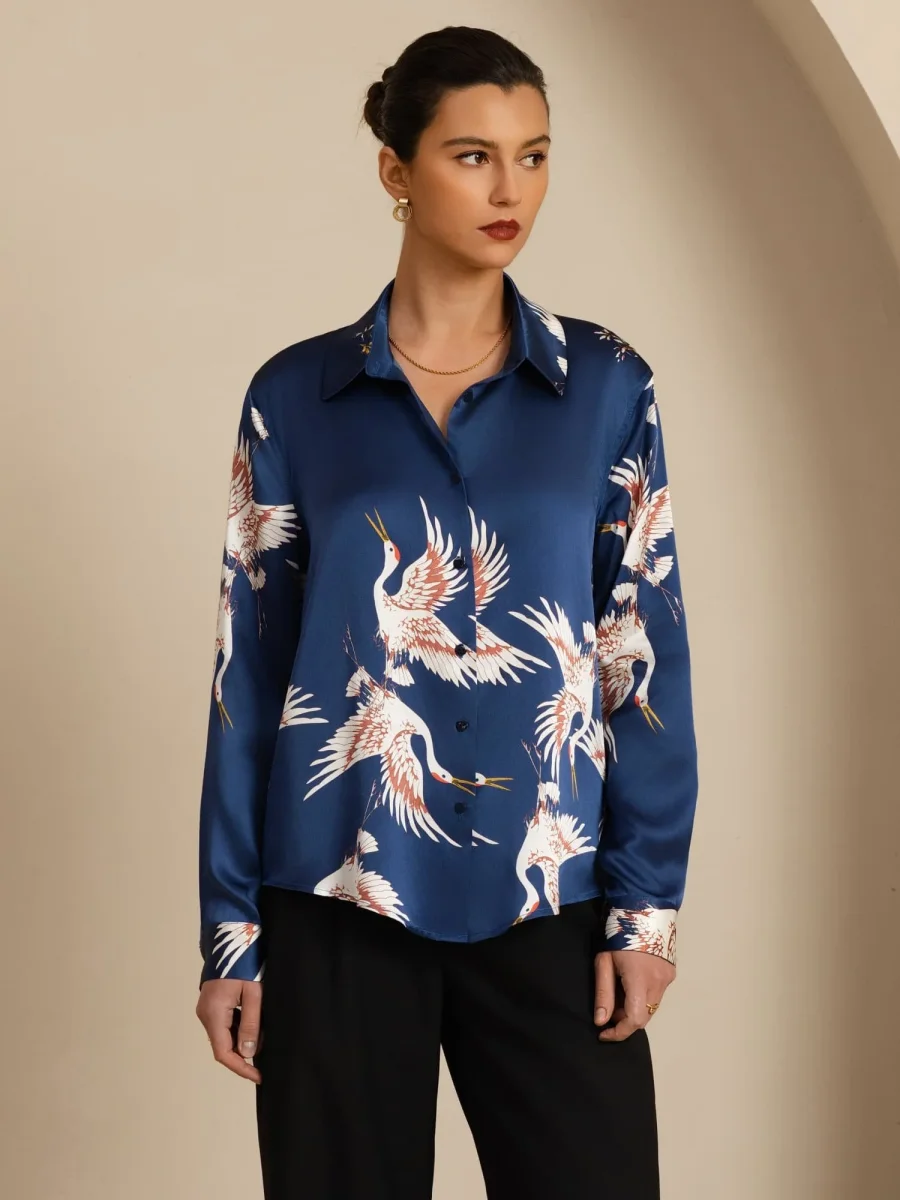 19 Momme Ren Siden Dam Blus Langarm Slagkrage Trana Tryck Med Knappar