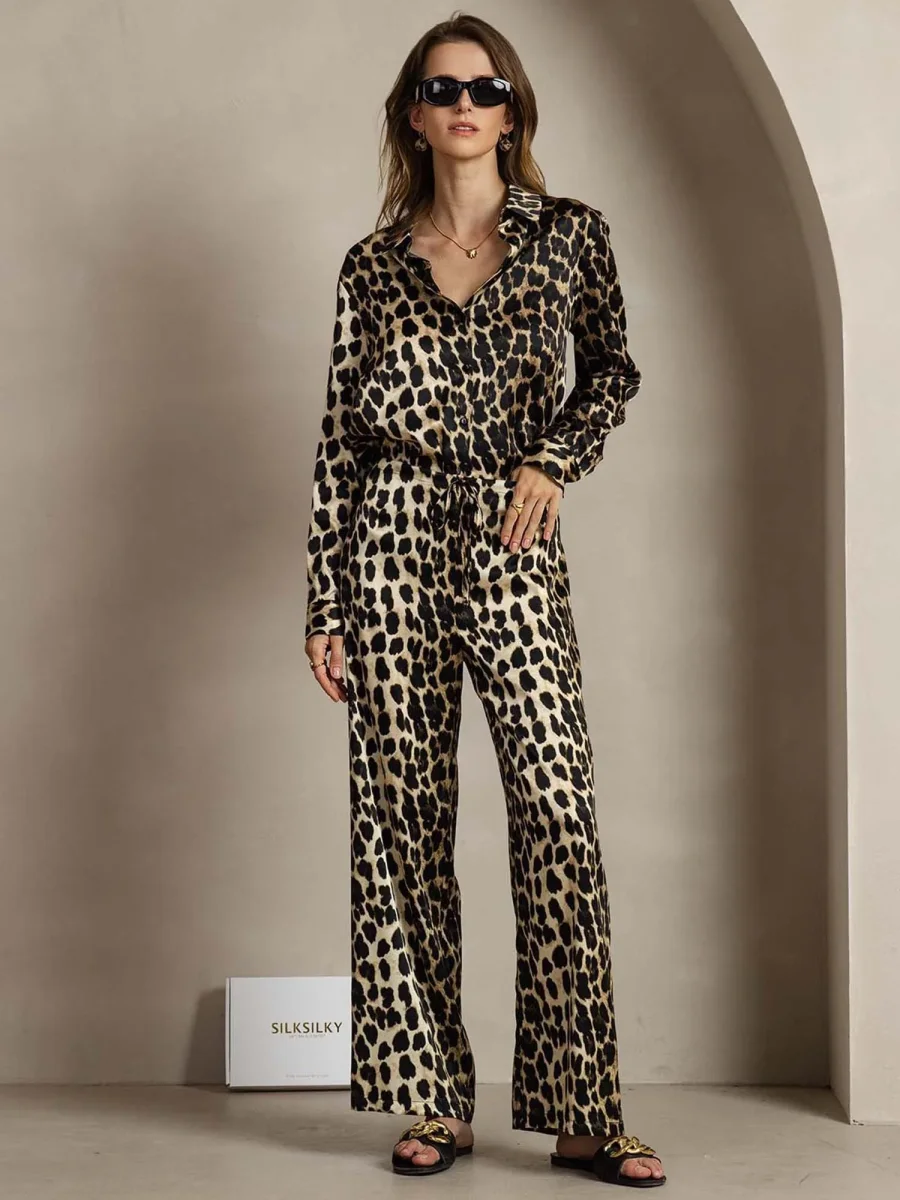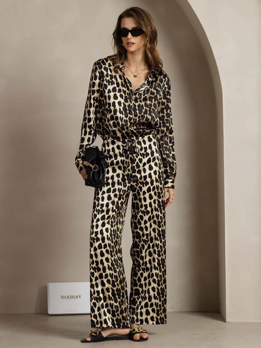 19Momme Dam Siden Leopardskriv Tryckt Knapp-Up Skjorta Och Vida Byxor Set