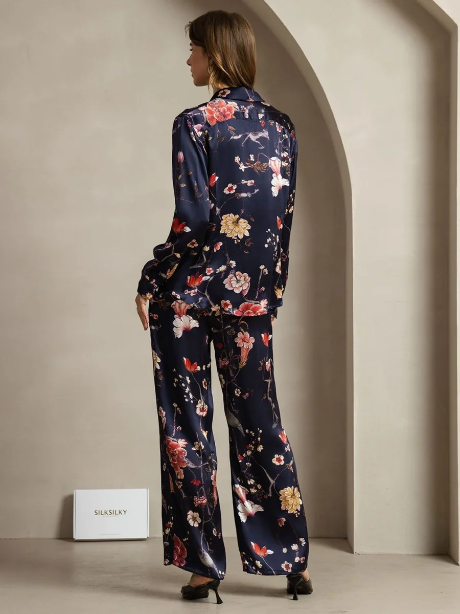 19Momme Dam Siden Marin Blommönster Knapp-up Skjorta Och Vida Byxor Set
