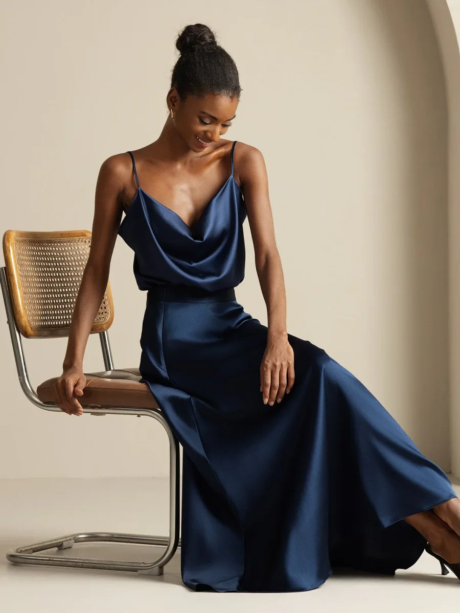 19Momme Silke Cowl Neck Spaghetti Strap Camisole Top & A-linje Maxi Kjol