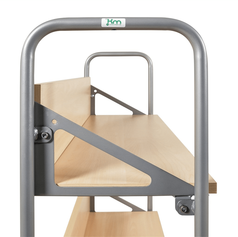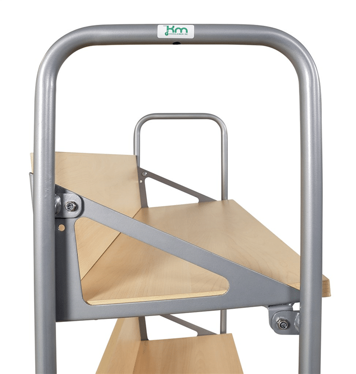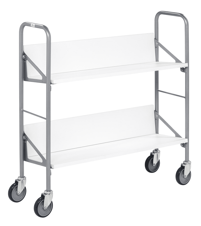 En pärmförvaring med 2 snedställda hyllor i vit melamin och pulverlackerat grått stativ. Pärmvagnen är smidig rullas enkelt fram och tillbaka efter behov. Levereras med 4 st bokstöd