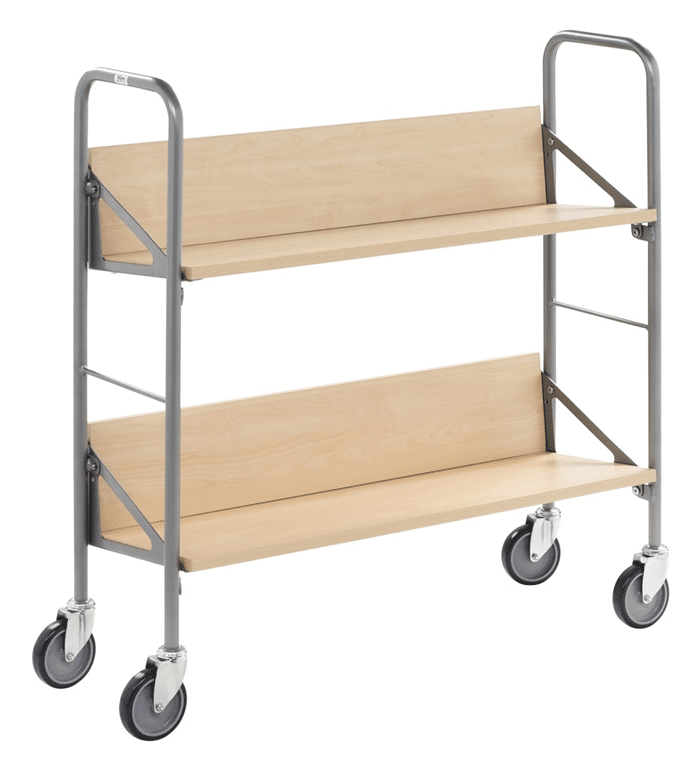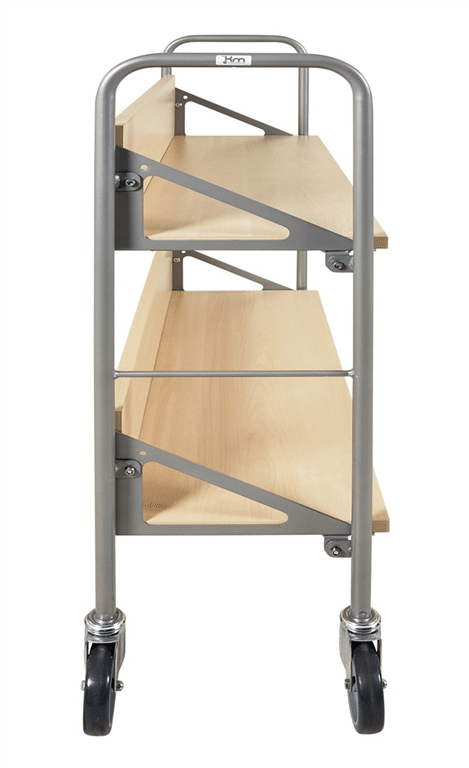 En pärmförvaring med 2 snedställda hyllor i björkmelamin och pulverlackerat grått stativ. Pärmvagnen är smidig rullas enkelt fram och tillbaka efter behov.