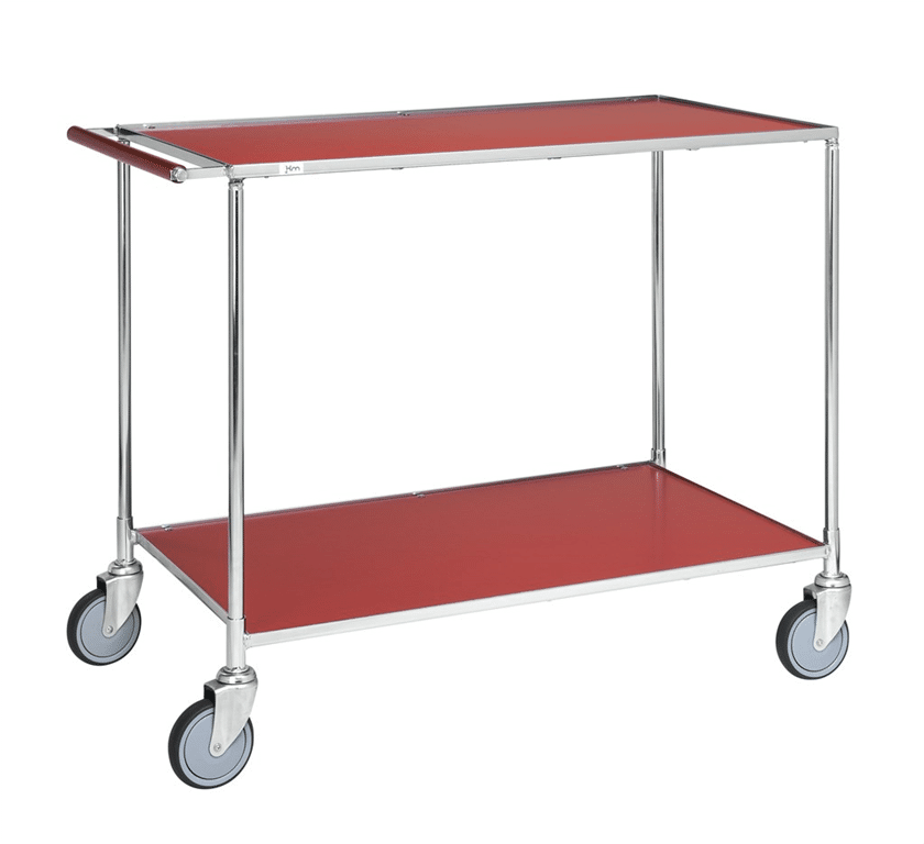 Mindre bordsvagn i 2 plan. Plastbeklätt handtag som motverkar kalla händer. Hyllplan av laminat. Levereras omonterad. Elförzinkad med laminatskivaPlastat greppvänligt handtag4 länkhjul 100 mmBelastning 200 kg
