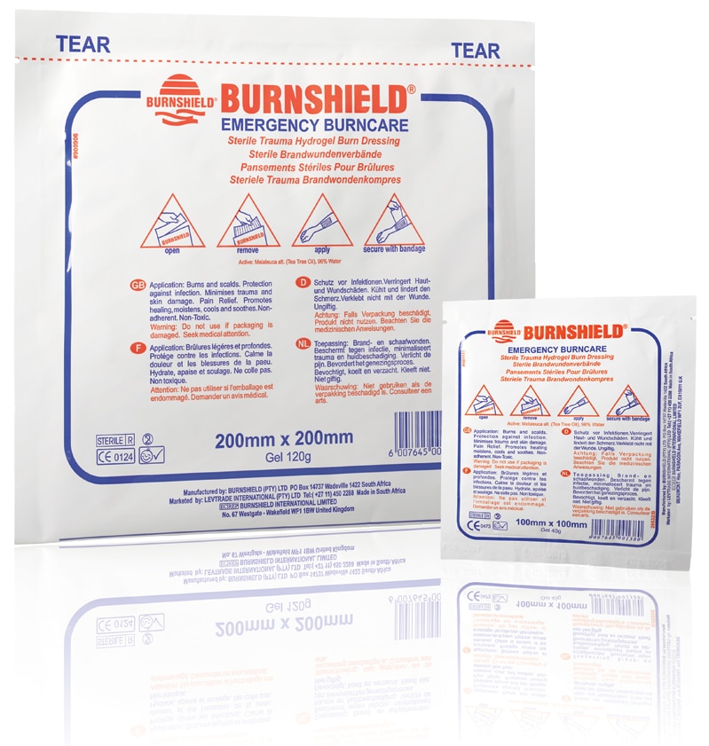 Brännskadeförband, Burnshield. 20x20cm. Burnshield brännskadeförband är indränkt med en vattenbaserad gelé som inte irriterar såret. Det fastnar heller inte i såret. Förbandet och gelén är lätt att avlägsna när annan behandling påbörjas på sjukhus.