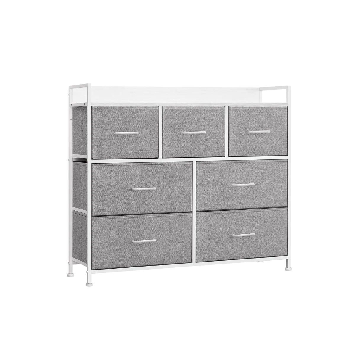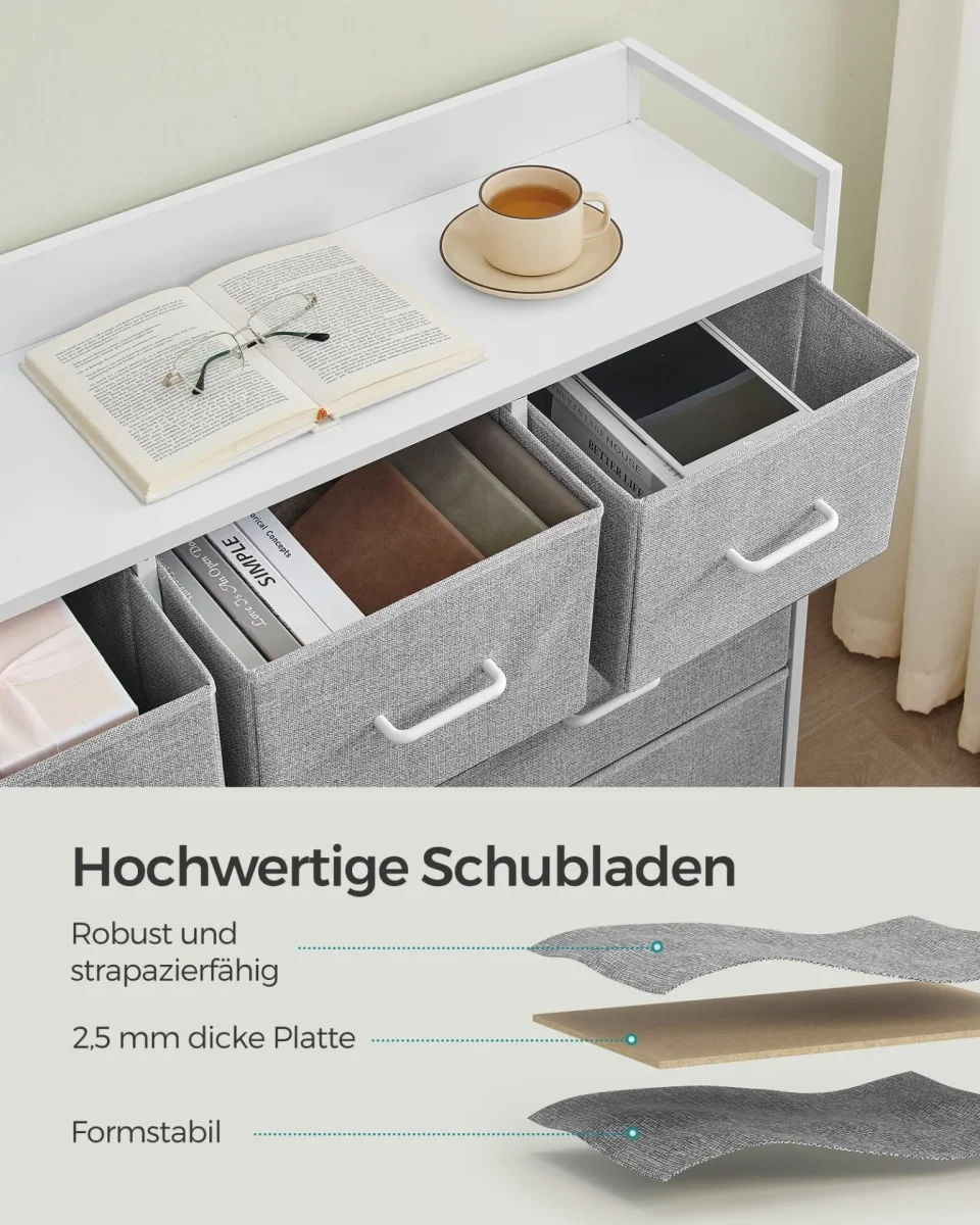 Ljusgråvit tygbyrå med 8 lådor, metallram och bordsskiva för garderob