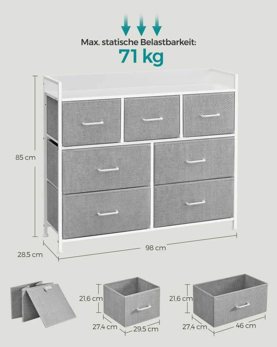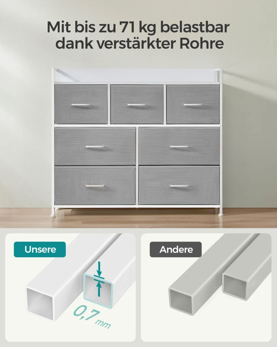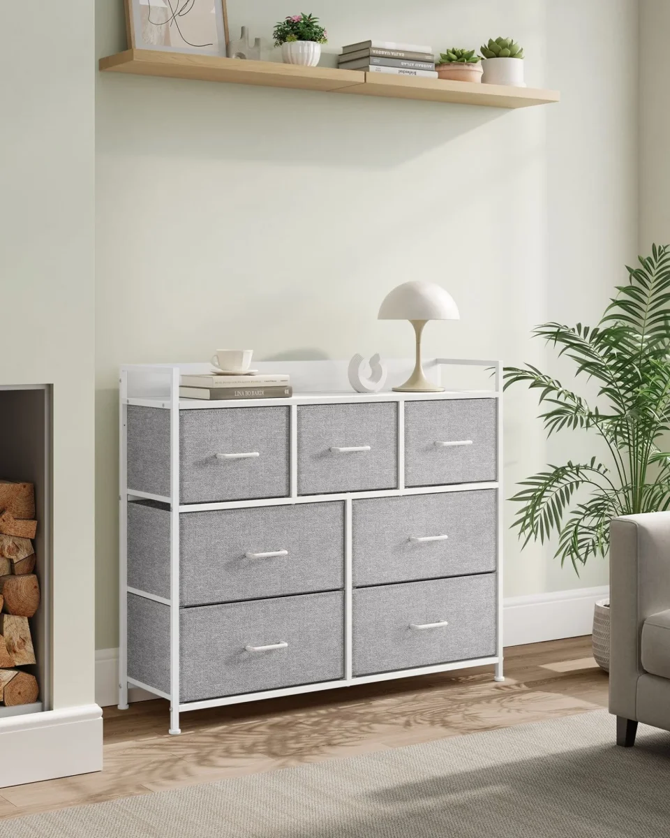 Byrå, Sovrumsskåp, 7 tyglådor med handtag, metallram, duvgrå och molnvit 【RYMLIG OCH SORTERAD】Du kan enkelt sortera dina saker med 7 lådor (4 stora och 3 små). Varje stor låda rymmer 60-70 strumpor, 13-16 t-shirts eller 7-11 par byxor. Varje liten låda rymmer 40-45 strumpor, 9-10 t-shirts eller 4-7 par byxor. 【STABIL OCH SÄKER】Denna byrå är […]
