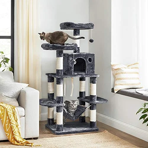 Specifikationer: Färg: Rökt grå Material: Spånskiva, plysch, sisalrep, kartong Produktstorlek: 21,7″L x 17,7″B x 59,1″H (55 x 45 x 150cm) Produktvikt: 34,2lb (15, 5 kg) Förpackningsinnehåll : 1 x Cat Tree 1 X Instruktioner