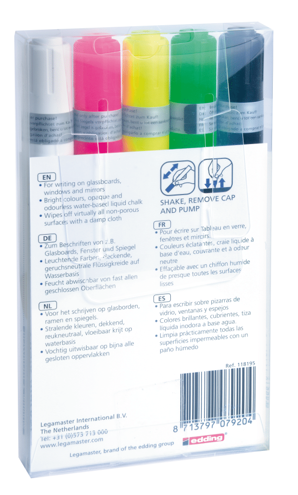 Speciellt framtagna pennor för att skriva på glastavlor, fönster och speglar! Färgen täcker mycket väl och syns väldigt bra. Pennorna är luktfria och färgen torkas enkelt bort med en fuktig trasa. Förpackningen innehåller 5 pennor, 1 x gul, grön, rosa, svart och vit