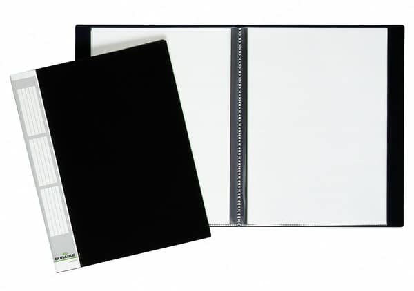 Demonstrations- och presentationsbok av polypropyleneplast med 20 fasta kopiesäkra plastfickor för A4-format. Istoppsficka på ryggen med instick för uppmärkning av innehållet.