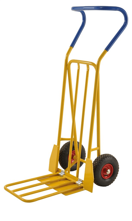 Robust kärra med rejäla 260mm luftgummihjul som gör den flexibel i sina användningsområden. Fällbart lastplan. Pulverlackerad. Unikt ergonomiskt handtag som gör att du enkelt kan hålla det i olika positioner.