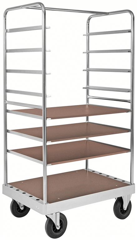 Etagevagn i vår kraftigaste serie av plattformsvagnar. Finns i flera utföranden. Gör sig utmärkt i tuffare miljöer där hanteringen är mer krävande. Serien innehåller plattformsvagn, bordsvagn, etagevagn, gavelvagn, lådvagn och skivvagn. Avstånd från bottenplattan till första gejdern 285 mm180 mm mellan gejdrarnaLevereras med 3 st hyllplan, kan placeras på 7 olika höjderFast handtag på 1000 mm höjdByglar 30 mm stålrörMaxlast/hylla, 100 kg2 fasta, 2 länk massiva gummihjul 200 x 50 mmBelastning: 800 kg