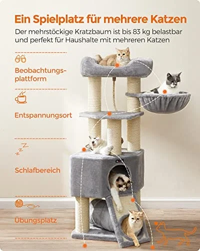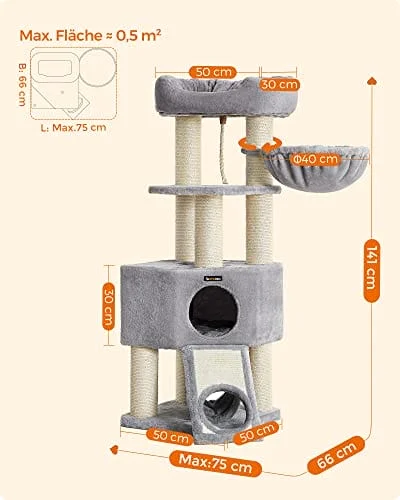 [Lämplig för upp till 5 katter] Skrapstolpen i flera nivåer kan hålla upp till 83 kg totalt och lämpar sig för flera katter. På plattformen för att observera, i hängmattan för att koppla av eller på sisalstolparna och skrapbrädan för att vässa klorna
