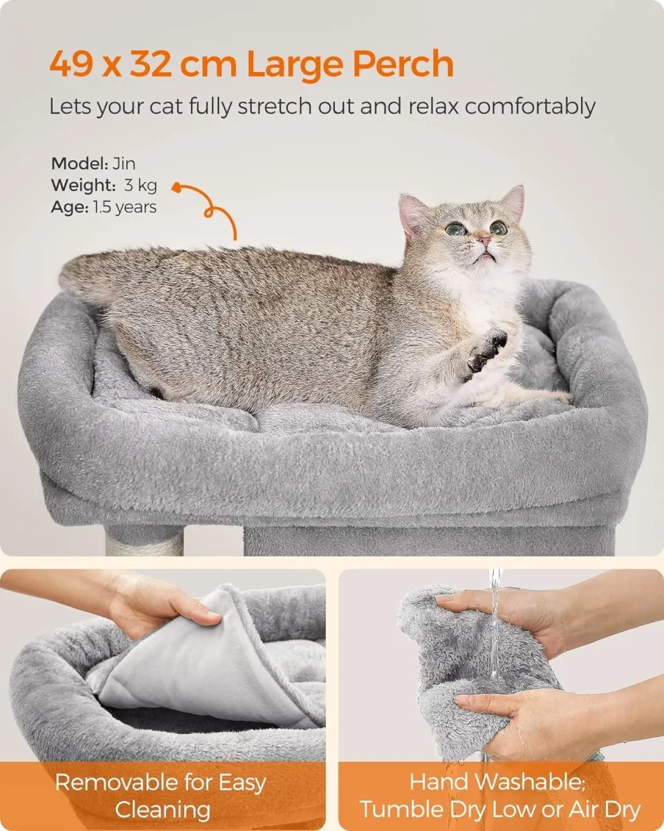 [Stor abborre] Det här kattträdet har en stor abborre på 49 x 32 cm med väl vadderade upphöjda kanter, vilket ger rymligt utrymme för din katt att helt sträcka ut och slappna av bekvämt