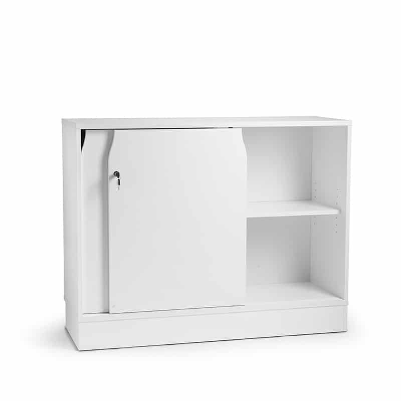 Snyggt och funktionellt förvaringsskåp med låsbara skjutdörar. 2 hyllplan med A4 pärmhöjd. Fungerar som en naturlig arbestsplatsavdelare. Levereras monterad och klar. Mått: 1200x430x940 mm.