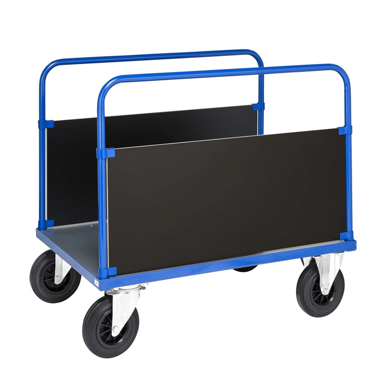 Smidig och lättmanövrerad gavelvagn med gavlar på långsidorna. Klarar laster upp till 500 kg. Kraftig och slittålig konstruktion med lång livslängd. Pulverlackerad med hög ytfinish för enkel rengöring. Lastplan och gavelskiva i stryktålig mdf. Stora gummihjul för enkel framkomlighet.