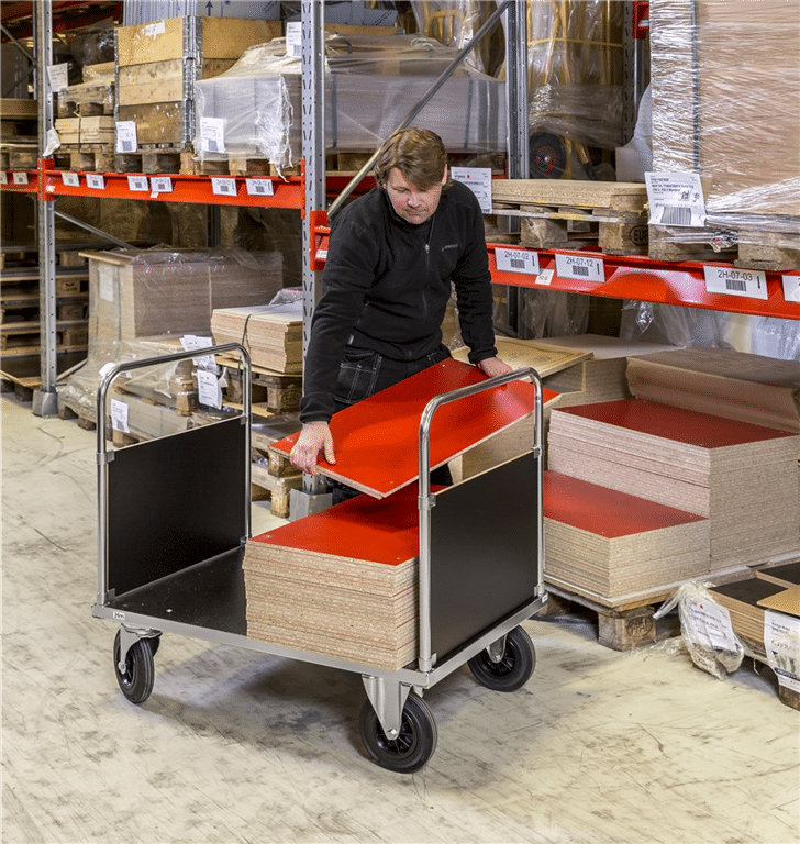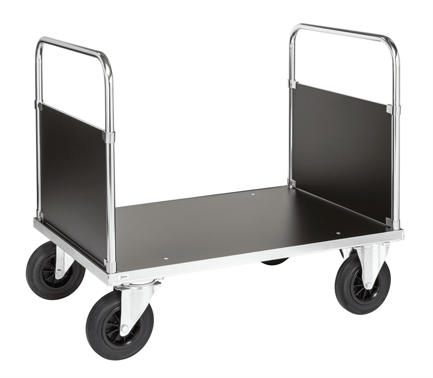 Smidig gavelvagn i flera utföranden. Finns med en eller två gavlar samt med eller utan broms. Serien innehåller plattformsvagn, bordsvagn, etagevagn, gavelvagn, lådvagn och skivvagn. Elförzinkad med laminatskivorHöjd till lastplan 260 mmGavelskiva i laminat, höjd 400 mmByglar 25 mm stålrör2 fasta, 2 länk massiva gummihjul 200 x 50 mmBelastning: 500 kg
