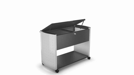 Hängmappsvagn i stilren design som rymmer ca 100 st hängmappar i A4-format. Med låsbart lock, stängd botten och med ett extra hyllplan. Handtag på båda sidor.Vagnen är utrustad med 4 st vridbara hjul som underlättar förflyttning. 2 st av hjulen är försedda med bromsar vilket ger stabilitet under användning. Tillverkad av metall med reptålig polyesterbeläggning. Mått: 695x985x440 mm (HxBxD)