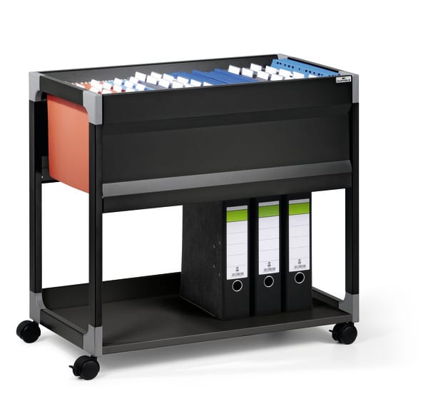 Denna mångsidiga hängmappsvagn rymmer 90 st hängmappar i A4-format, 8 st hängpärmar i standardformat (80 mm) eller 15 st hängpärmar i mindre format (40 mm). Med ett extra hyllplan som rymmer 8 st pärmar. Avstånd mellan spåren: 330 mm. Mått: 715x750x432 mm (BxHxD).