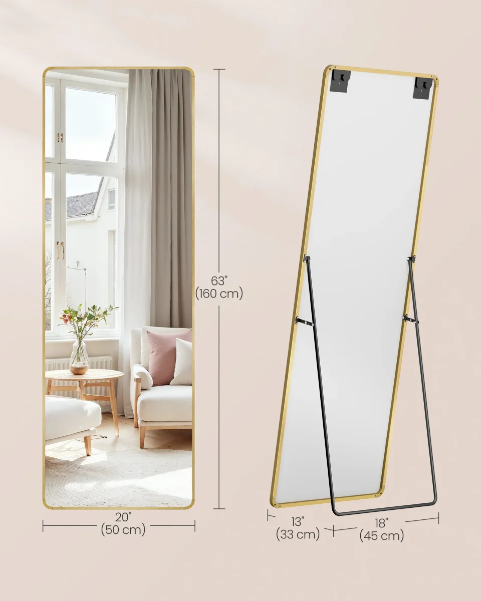 Funktioner: Färg: Ljusguld Material: Härdat glas, aluminiumlegering Mått: 160 x 50 cm (L x B) Vikt: 6,8 kg Leveransen inkluderar: 1 x Helfigursspegel 1 x Monteringssats 1 x Bruksanvisning