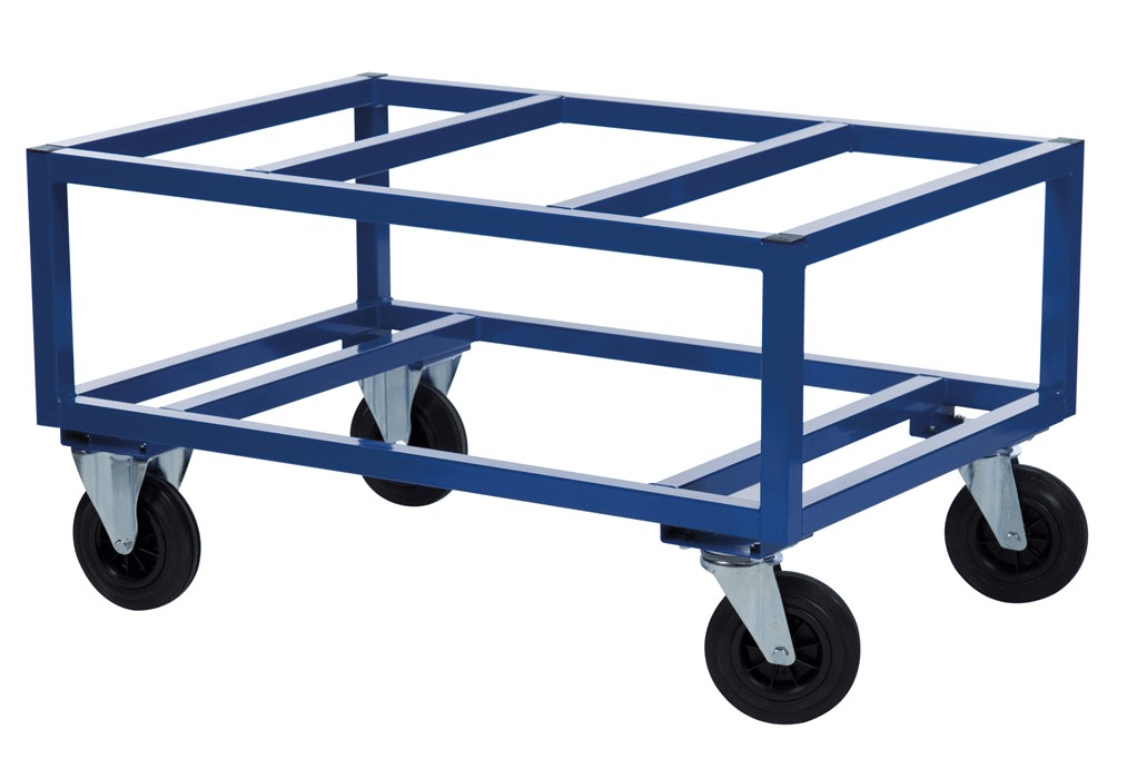 Stabil pallvagn för EUR-pall 1200×800 mm. Vagnen har en fast höjd på 650 mm. Konstruktion anpassad för dagligt bruk inom industri, verkstad och produktion. Pallvagnen är utrustad med 4 lättrullade, massiva gummihjul med en diameter på 200 mm. (2 fast & 2 rörliga). Pulverlackerad i blå färg med hög ytfinish för ökad livslängd.