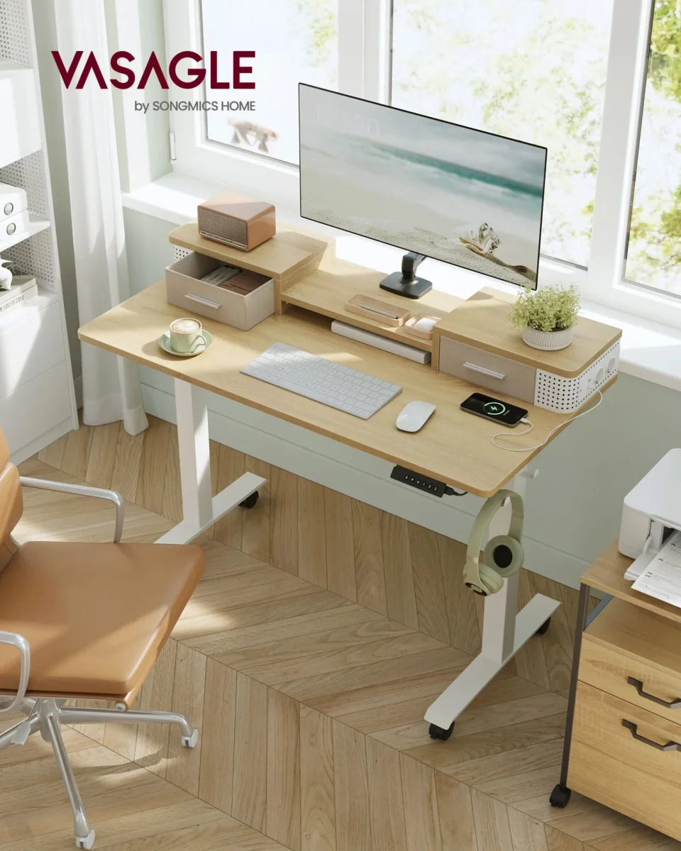 [Högkvalitativ motor] Säkerställer smidig justering och låg ljudnivå (<50 dB); Höjdjusteringsmekanismen stoppar och dras in något vid hinder för att skydda skrivbordet från skador. [Med krok och belysning] Sidokroken kan användas för att hänga hörlurar för enkel åtkomst; Den medföljande justerbara LED-belysningen lyser upp din arbetsyta samtidigt som den förbättrar atmosfären. [Stabil konstruktion] Den dubbla stödstången ger denna bordsskiva hög stabilitet – ingen mer oscillation. Tack vare stålramen kan detta höjdjusterbara skrivbord hålla upp till 80 kg. Produktdetaljer: – Färg: halmgul – Material: spånskiva, stål, oxfordtyg – Storlek: 60 x 120 x (72-120) cm (D x B x H) – Vikt: 31 kg