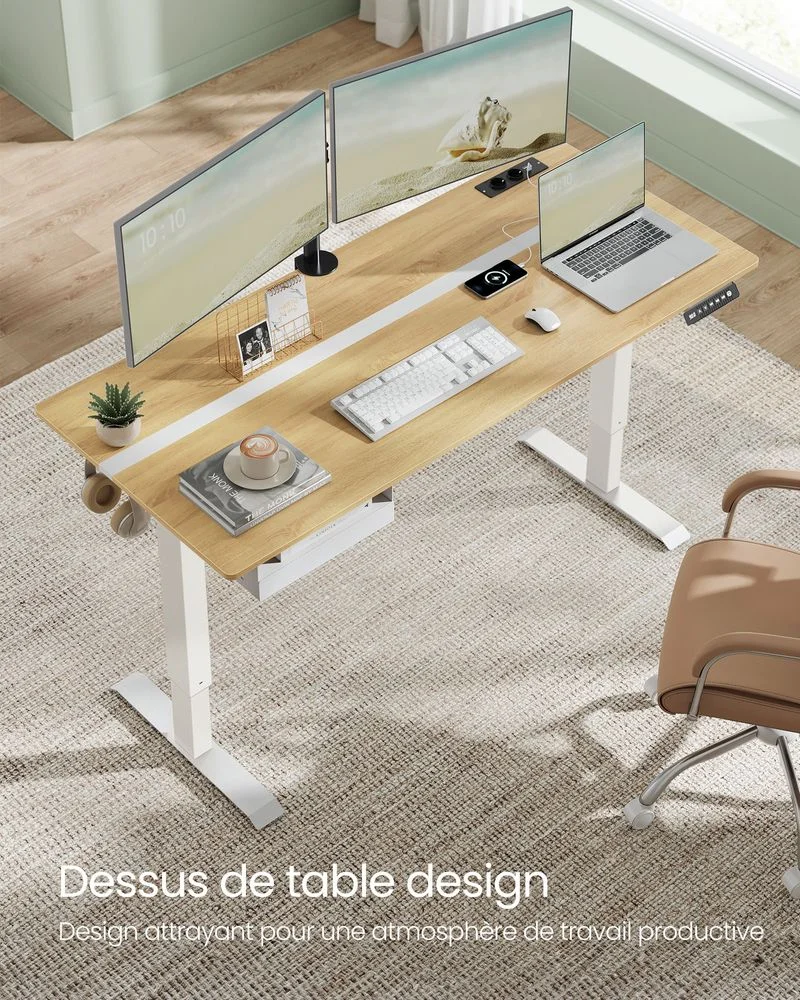[Designerbordsskiva] Med sina olika färger och texturer är detta sitt-stå-skrivbord snyggt och skapar en produktiv arbetsmiljö.