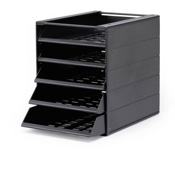 Blankettbox för dokument upp till A4 format. Med 5 utdragbara lådor. Blankettboxen kan placeras i skåp, på hyllor eller bänkar. Produkten är miljömärkt med miljömärkningen Blue Angel. Mått: 250 x 332 x 322 mm (B x H x D) Material: polystyrene, min. 80% återvunnet material