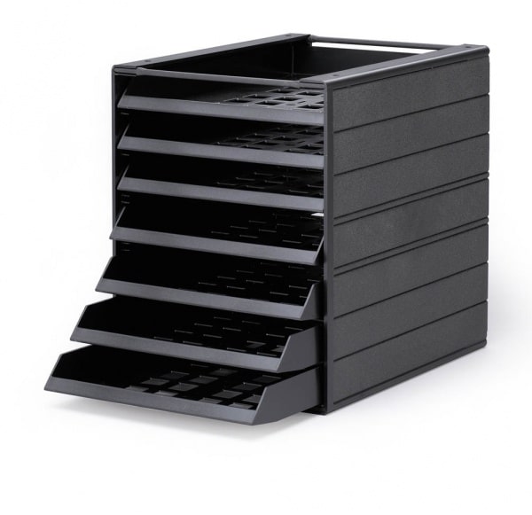 Blankettbox för dokument upp till A4 format. Med 7 lådor. Blankettboxen kan användas i skåp, på hyllor eller bänkar. Produkten är miljömärkt med miljömärket Blue Angel. Mått: 250 x 332 x 322 mm (B x H x D) Material: polystyrene, min. 80% återvunnet material