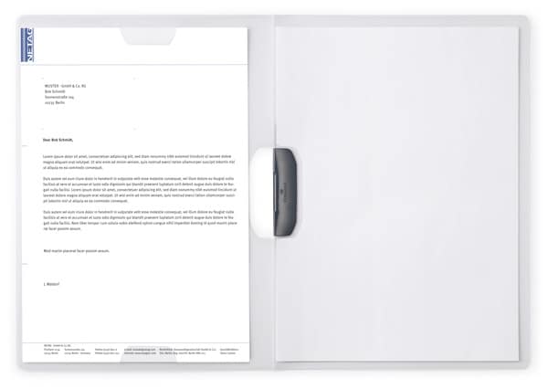 Stilren transparent klämmapp med extra flik för att hålla noteringar eller dokument på plats. Mappen passar utmärkt för förvaring av presentationer, offerter och dokument som inte behöver hålas. Rymmer 1-30 A4 ark. Enkel att använda: dra ut klämman, lägg i dokumenten, sväng tillbaka klämman och dokumenten ligger på plats.