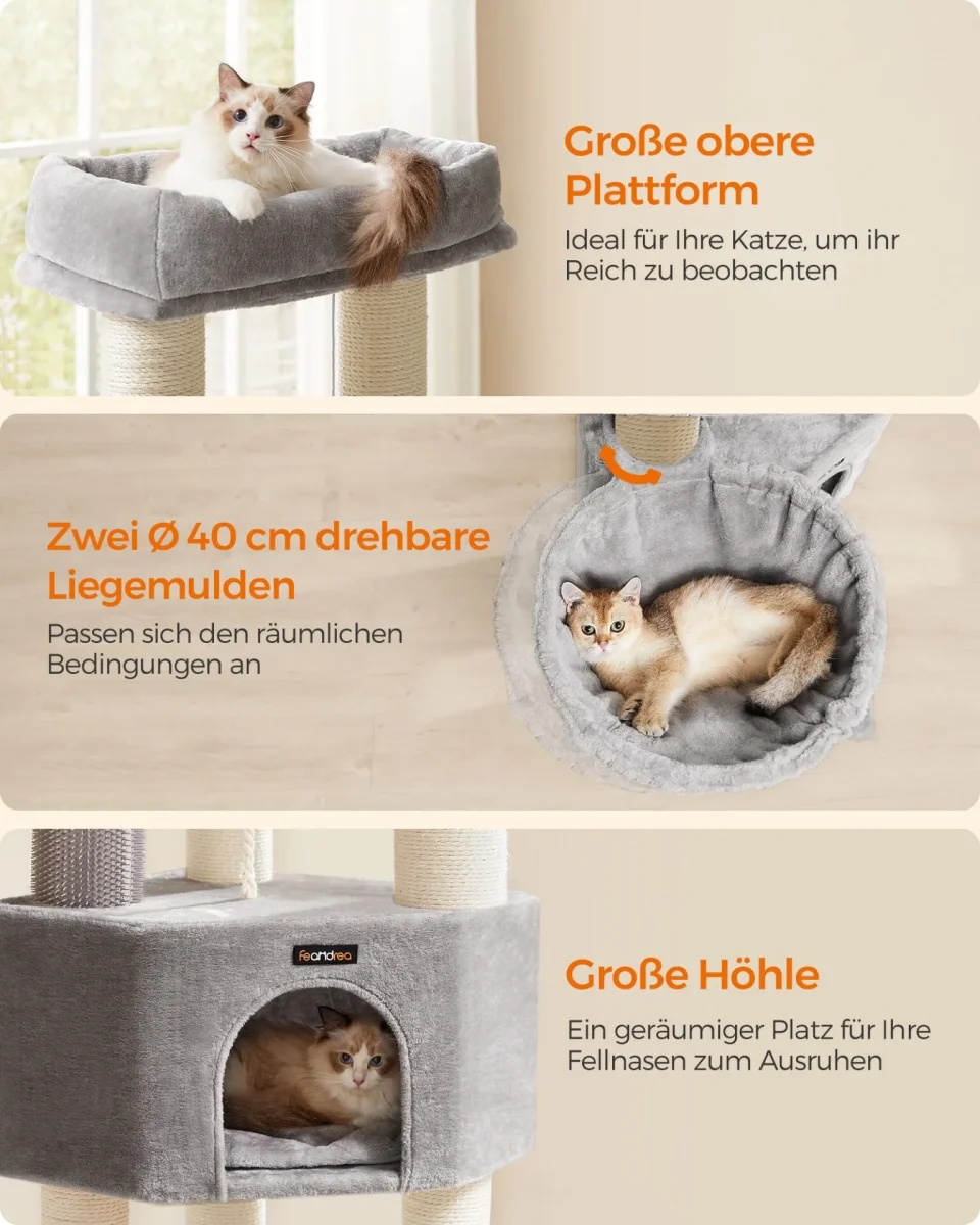[9 tjocka klösträd] Katter älskar att klösa. Med 9 slitstarka klösträd som är insvepta i 5,6 mm tjocka sisalrep kan de klösa till hjärtats belåtenhet med detta klösträd och låta din soffa gå!