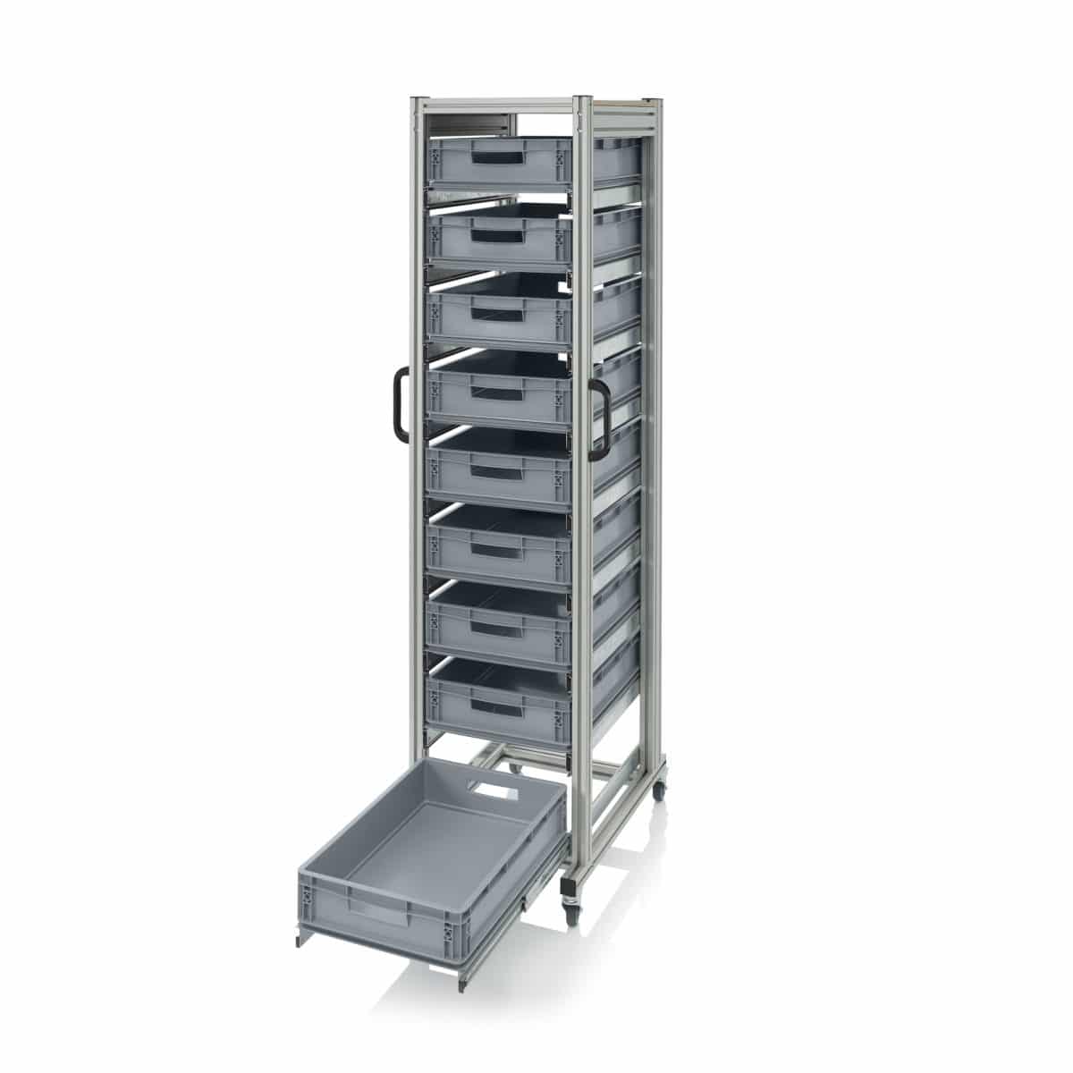 Systemvagn för eurobackar. Mobil backvagn med 9 plastbackar på utdragbara hyllplan. Vagnen är tillverkad i aluminiumprofil som tål hög belastning. Levereras komplett med 9 eurobackar med mått: 600x400xx120 mm