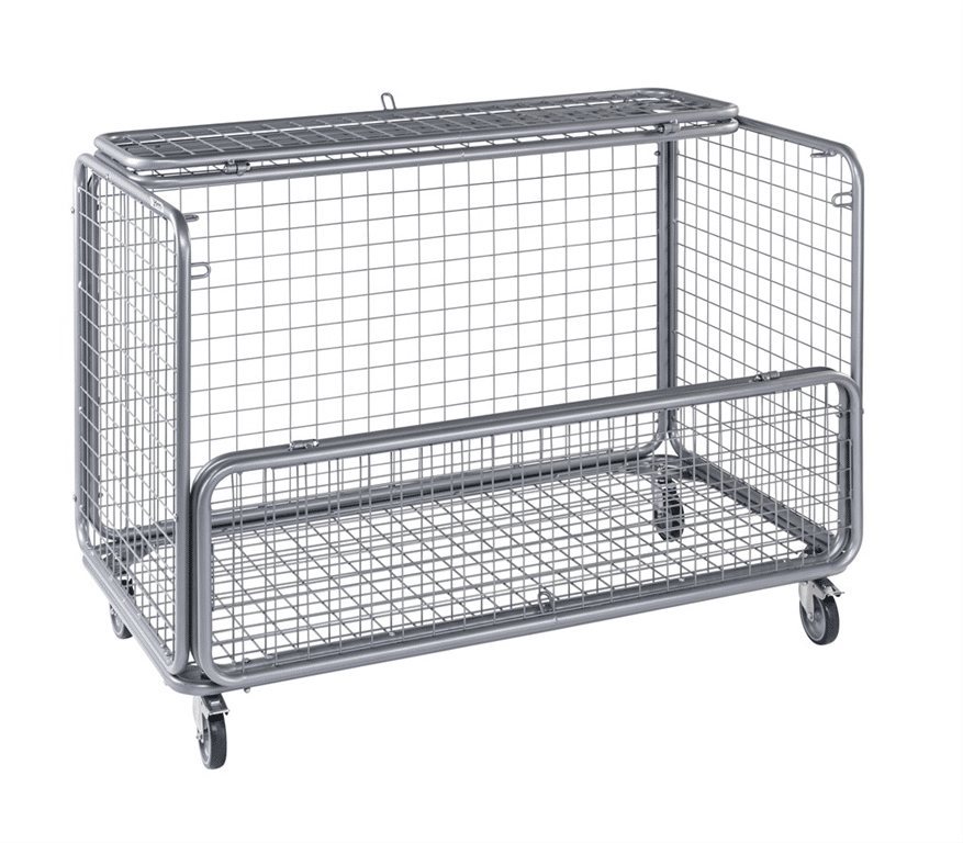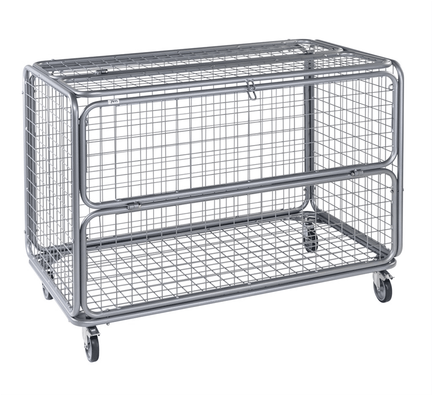 Låsbar nätbur (med hänglås) förvarings vagn till leksaker/bollar. Maskstorlek 45mm. Levereras med 4st 100 mm länkhjul varav 2st med broms. Halva överdelen är öppningsbar.