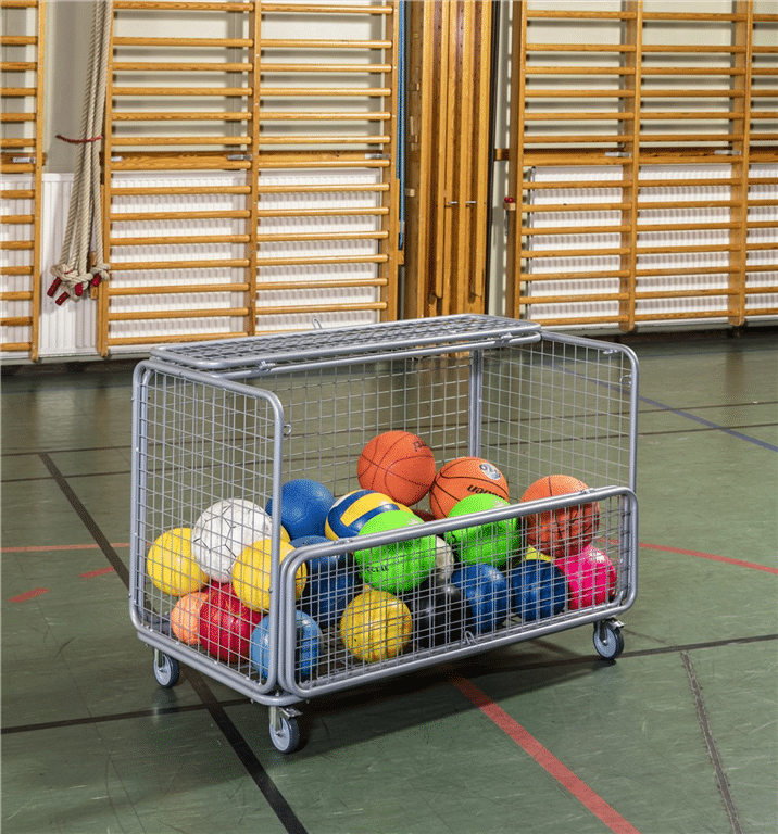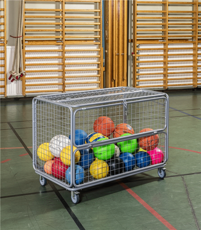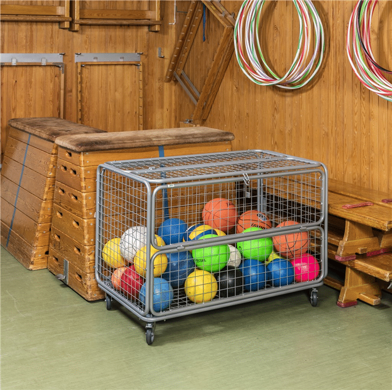 Låsbar (med hänglås) förvarings vagn till leksaker/bollar. Maskstorlek 45mm. Levereras med 4st 100 mm länkhjul varav 2st med broms. Halva överdelen är öppningsbar.
