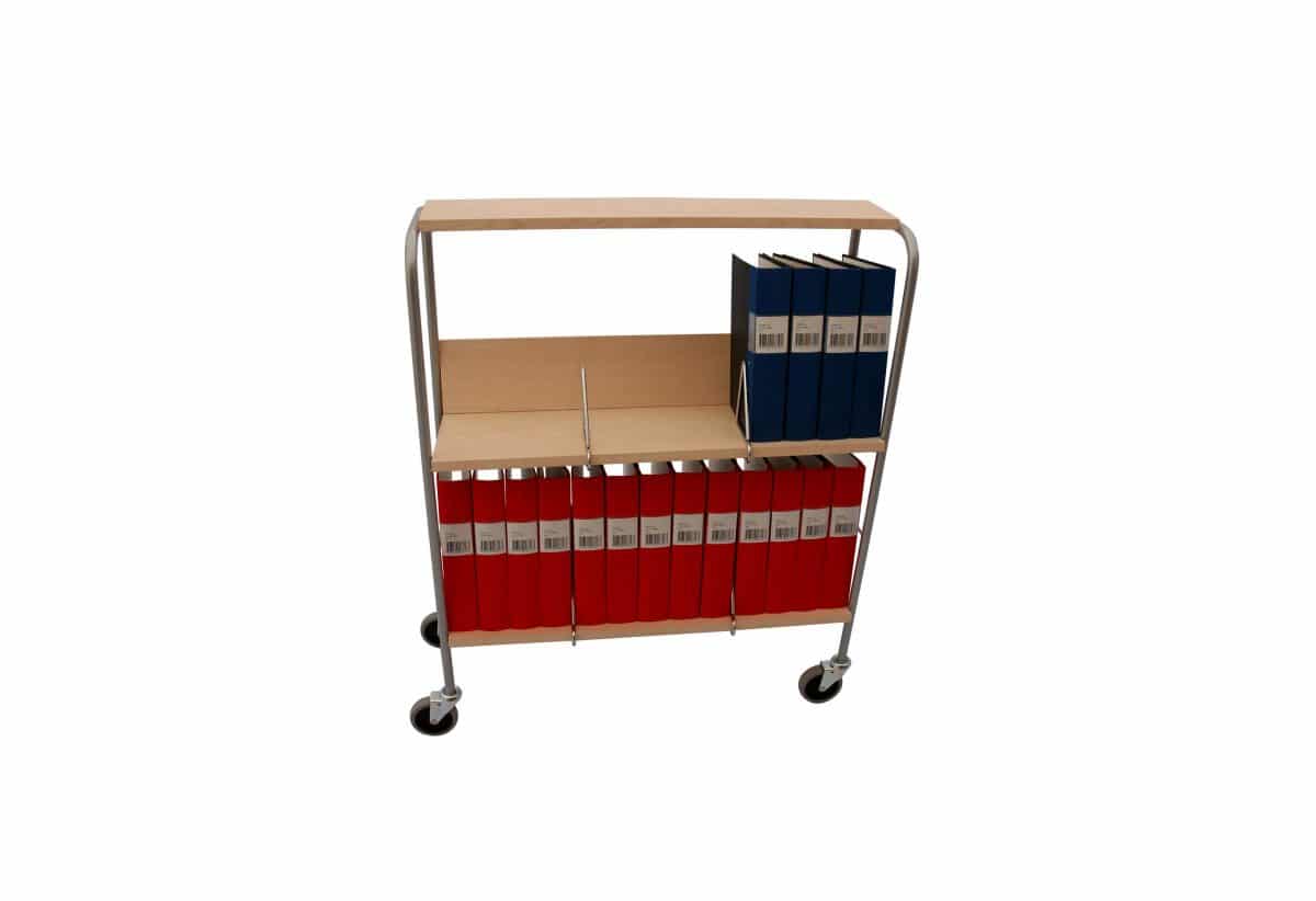 Vagn med två snedställda hyllplan för förvaring och transport av ca 24 pärmar