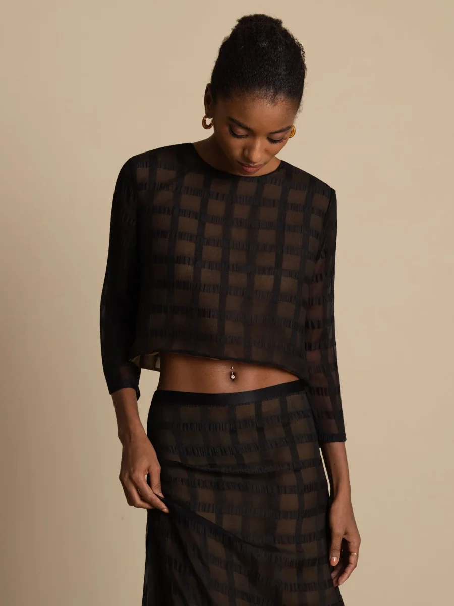 Tillverkad av sidenorganza med ren sidenfoder och har ett texturerat rutigt jacquardmönster. Detta lyxiga set inkluderar en crop-top och en tea-längd kjol för en mångsidig lager-på-lager-look. Hög midja med justerbar knytning framhäver midjan, medan långa ärmar och rund hals balanserar elegans och komfort. Lagerkonstruktionen skapar rörelse, och det rutiga jacquardmönstret ger tidlös sofistikering. Perfekt för avslappnad vardagsstil eller förfinade tillfällen.