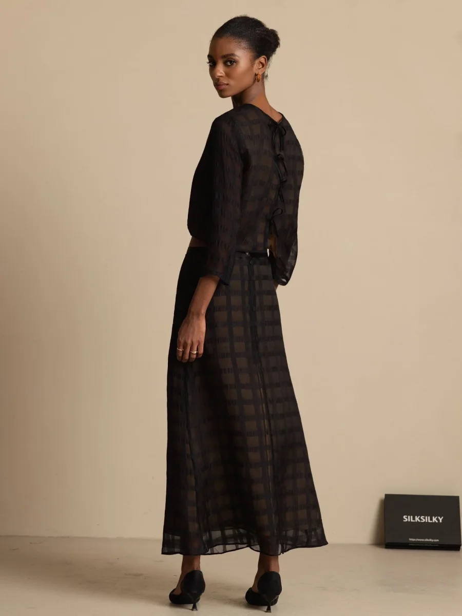 Ren Siden Dam Texturerad Rutigt Crop Blus & A-Linje Lång Kjol Set