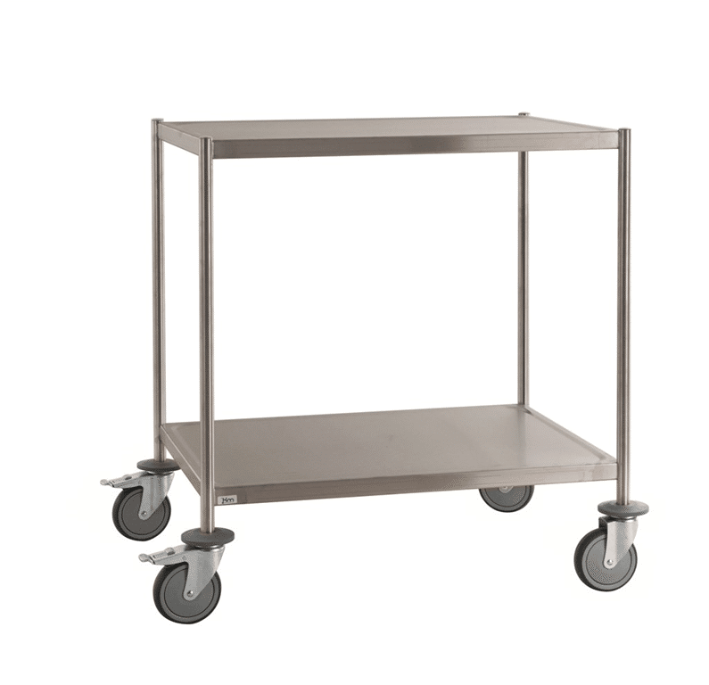 Helsvetsad vagn i 2 plan. Vagnen är väl anpassad för att användas inom livsmedelshantering och kök eller t.ex. i labmiljö.