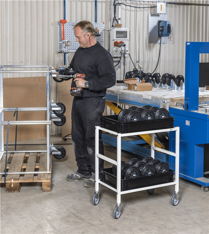 Smidigt rullbord med 2 hyllplan. Hyllplanen kan monteras med kant upp eller ner efter eget önskemål. Pulverlackerad med hög ytfinish gör bordet lätt att hålla rent och hygieniskt.