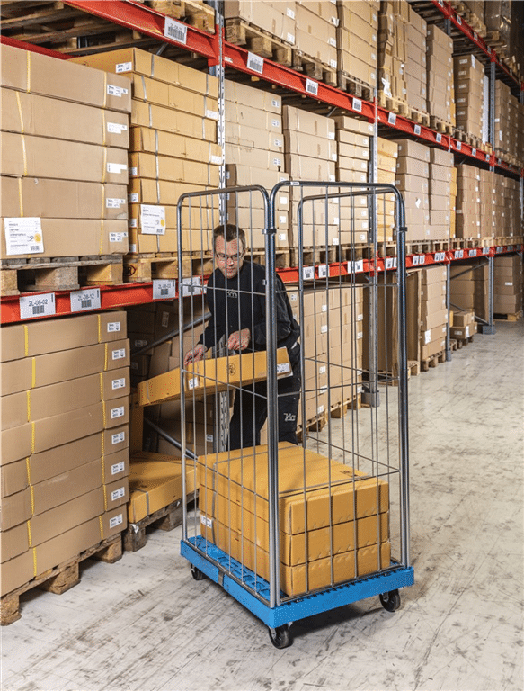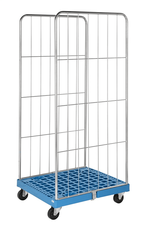 Rullcontainer med 2 nätsidor i metall och hygienisk plastbotten för lagring, transport och distribution inom all handel.