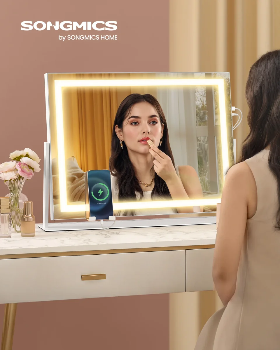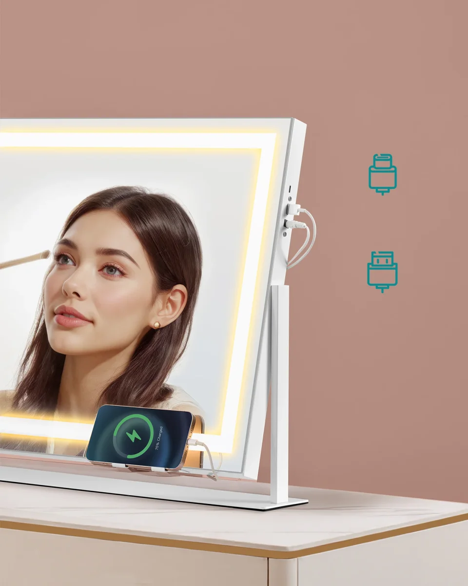Förenklad videostreaming och laddning: Telefonhållaren kan fästas på valfri sida. 1 USB-A-port och 1 USB-C-port strömförsörjer dina enheter under hela din skönhetsrutin.