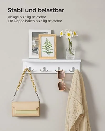 Klart på ett ögonblick: Vi kommer att göra ditt liv mer bekvämt. Fixa vägghyllan med den medföljande tillbehörssatsen och täck skruvarna med lock, jobbat klart! Häng dina väskor, halsdukar och nycklar på de 4 dubbla krokarna, ta sedan tag och gå