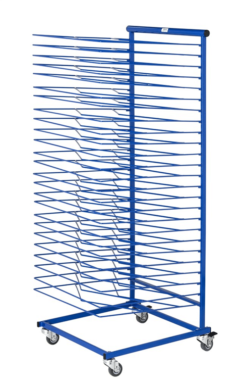Blå torkvagn perfekt till att torka ex. barnens konstverk i vattenfärg. Levereras omonterad. Pulverlackerad Torkställ för målningar och teckningar Avstånd mellan hyllplan 30 mm 4 st länkhjul varav 2 med broms, 50 mm Belastning: 10 kg