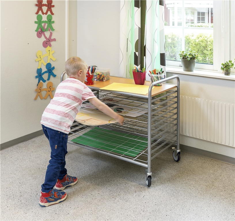 Torkvagn med 15 hyllplan. Vagnen finns i 3 modeller. Utdragbara näthyllplan som är perfekta till att t.ex. torka barnens egna målningar i vattenfärg. Enkel montering. Lackerad konstruktion för lång livslängd. Övre hyllplan i boklaminat. Höjd till övre hyllplan 1010 mm.