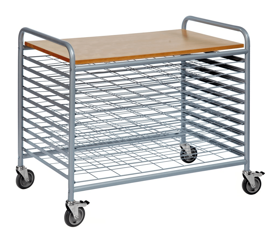 Praktisk torkvagn på hjul som finns i 3 modeller. Utdragbara näthyllplan (955×600 mm) som är perfekta till att torka ex. barnens konstverk i vattenfärg. Levereras omonterad. Pulverlackerad, övre hyllplan i boklaminat. Höjd till övre hyllplan 770 mm. Avstånd mellan hyllplan 45 mm. 10 plan.
