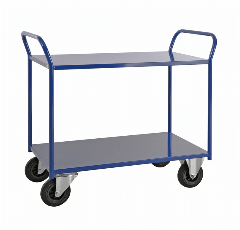 Helsvetsad robust plåtvagn i 2 plan med kant. Lämpar sig för de tyngre lasterna i de riktigt tuffa miljöerna. Finns som standard i 6 modeller. Pulverlackerad eller elförzinkadHöjd till översta hyllplan 780 mmAvstånd mellan hyllplan 540 mm 2 fasta 2 länkhjul 160 mmBelastning: 400 kgFinns i flera upplagor i olika färger, med eller utan broms och kant