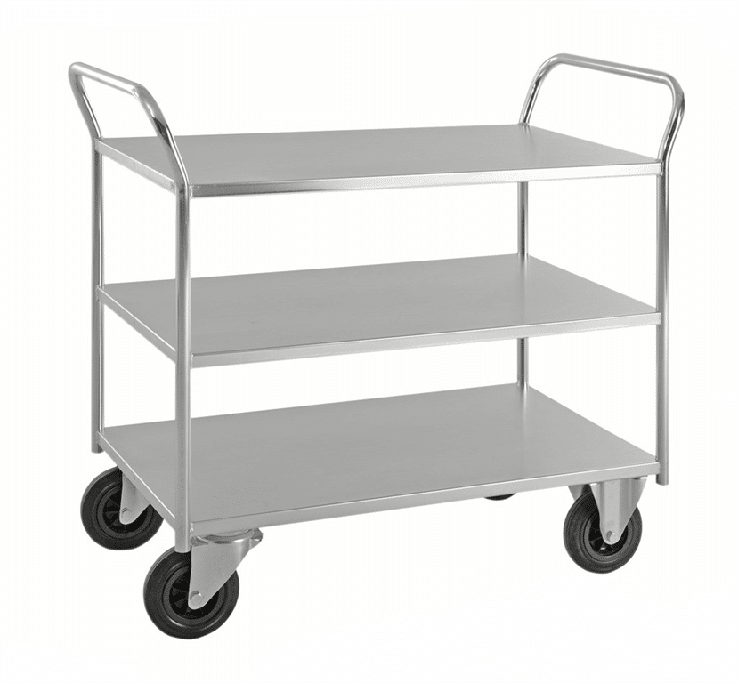 Helsvetsad robust plåtvagn i 3 plan utan kant. Lämpar sig för de tyngre lasterna i de riktigt tuffa miljöerna. Finns som standard i 6 modeller. Pulverlackering eller elförzinkadHöjd till översta hyllplan 780 mm (KM4127, KM4134, KM4169, KM4176)Höjd till översta hyllplan 1380 mm ( KM4144, KM4149)Avstånd mellan hyllplan 260 mm (KM4127, KM4134, KM4169, KM4176)Avstånd mellan hyllplan 550 mm ( KM4144, KM4149)2 fasta 2 länkhjul 160 mmBelastning: 400 kg
