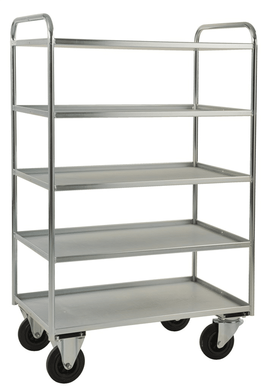 Hög helsvetsad robust plåtvagn i 5 plan med kant. Lämpar sig för de tyngre lasterna i de riktigt tuffa miljöerna. Finns som standard i 6 modeller. Pulverlackerad eller elförzinkadHöjd till översta hyllplan 1380 mmAvstånd mellan hyllplan 260 mm2 fasta 2 länkhjul 160 mmBelastning 400 kg