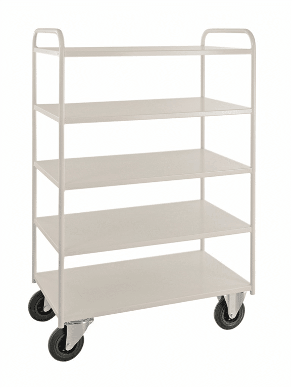 Hög helsvetsad robust plåtvagn i 5 plan utan kant. Lämpar sig för de tyngre lasterna i de riktigt tuffa miljöerna. Finns som standard i 6 modeller. Pulverlackerad eller elförzinkadHöjd till översta hyllplan 1380 mmAvstånd mellan hyllplan 260 mm2 fasta 2 länkhjul 160 mmBelastning 400 kg