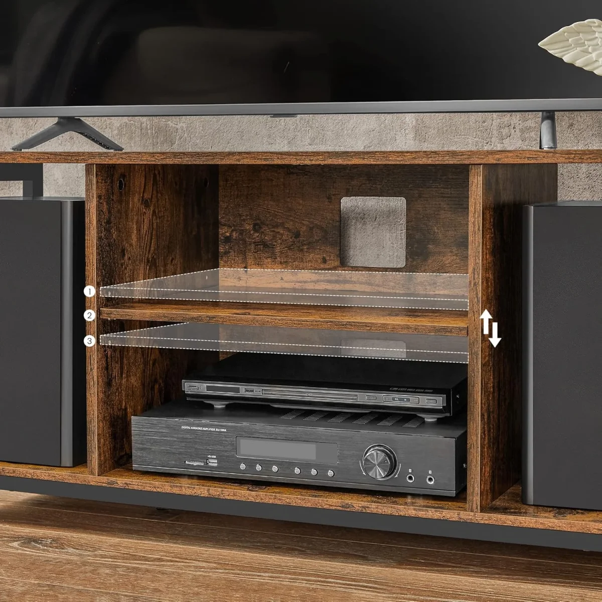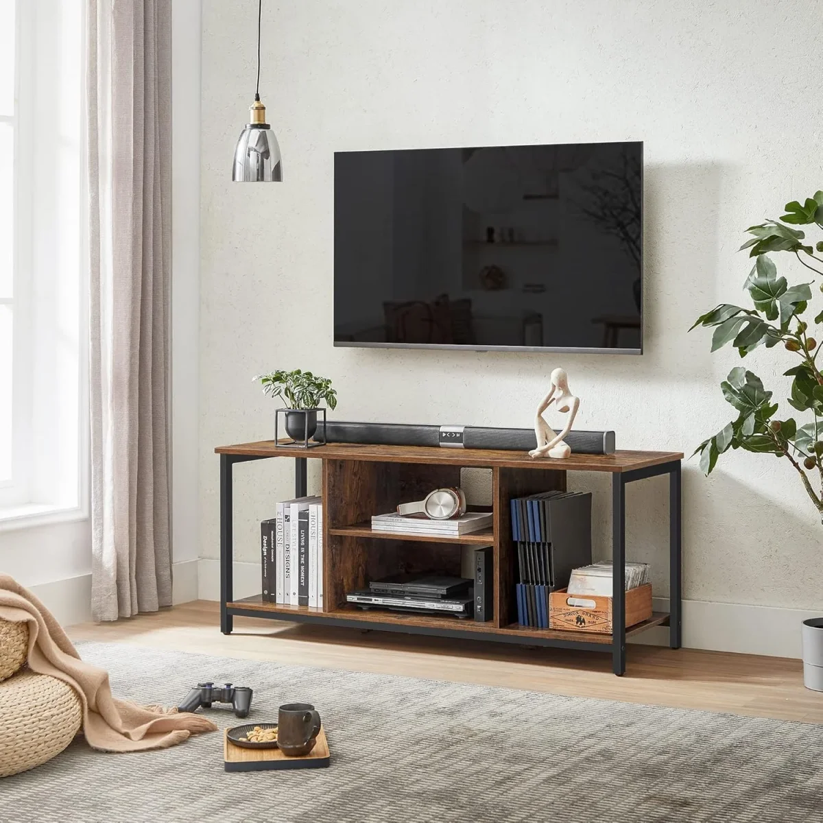 TV-bänk för TV upp till 60 tum, TV-skåp med öppna hyllor, rustik brun och svart