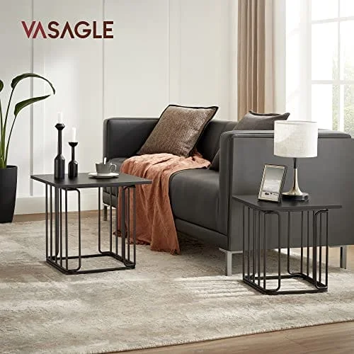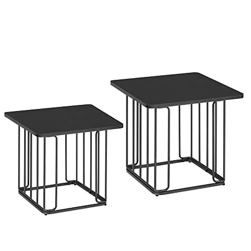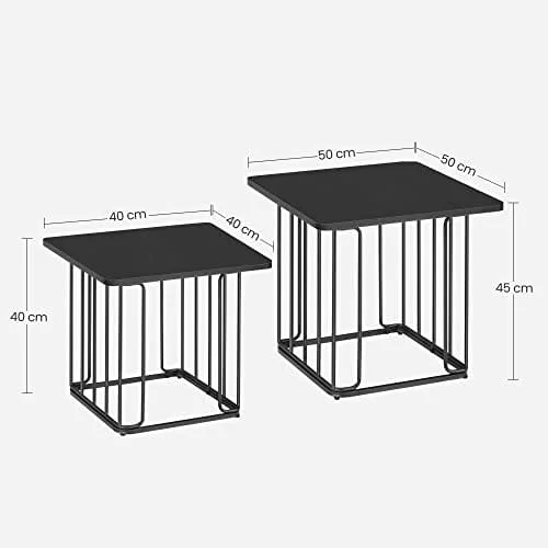 Specifikationer:- Färg: Svart Material: Spånskiva, stål stort bordsstorlek: 50 x 50 x 45 cm (L x B x H)- Litet bordsmått: 40 x 40 x 40 cm (LXBXH)- Total produktvikt: 8,3 kg- max. Statisk lastkapacitet per Bord: 30 kg Paketinnehåll:- 2 x sidobord- 2 x Monteringssats- 1 x Instruktioner